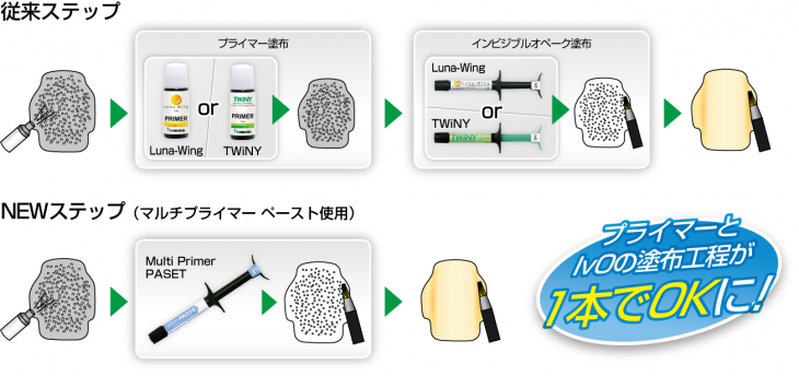 図1に示すとおり、従来は金属の表面にプライマーを塗布、乾燥させ、その後インビジブルオペークを塗布し光重合を行う必要がありましたが、「マルチプライマー ペースト」では、この作業が1本で可能となるため、作業時間短縮の効果があります。