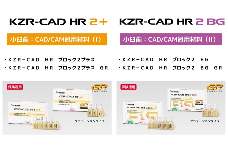 「CAD/CAM冠用材料(Ⅱ)」には「KZR-CAD HR ブロック2 BG」をラインアップしており、症例に応じた使い分けが可能です。