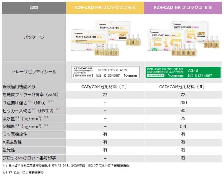 「KZR-CAD HR ブロック2プラス」「KZR-CAD HR ブロック2 BG」の材料特性