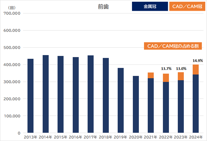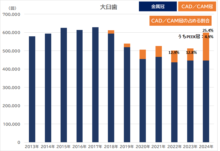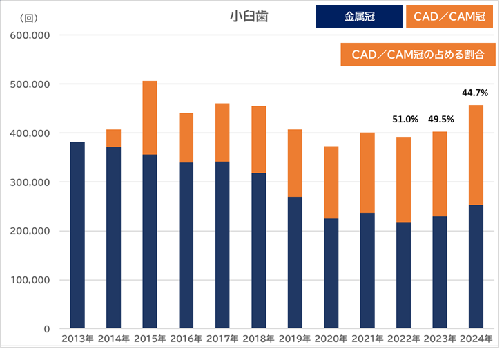 最新の統計(2024年8月分)では、金属とCAD/CAM冠の合計のうち、CAD/CAM冠が占める割合は小臼歯が44.7%(前年比−4.8%)、大臼歯が25.4%(前年比+12.6%)、前歯14.9%(+1.9%)でした。