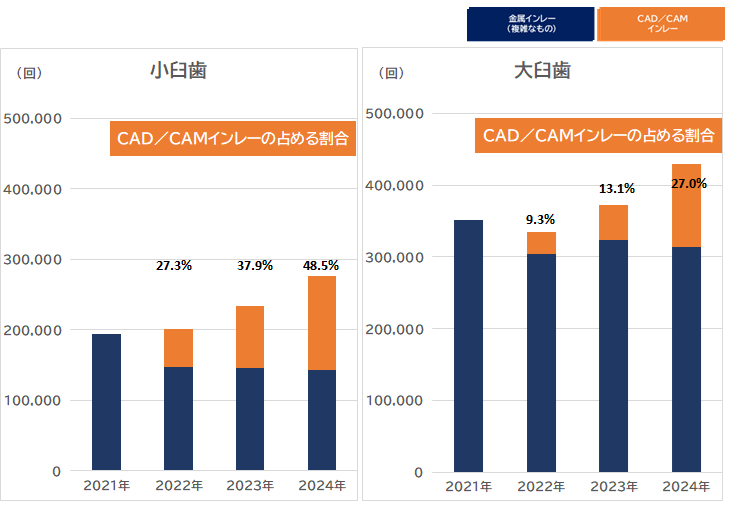 最新の統計(2024年8月)でみてみると、金属インレー(複雑なもの)とCAD/CAMインレーの合計のうち、CAD/CAMインレーの占める割合は、小臼歯では48.5%(前年比+10.6%)、大臼歯では27%(前年比+13.9%)を示しており、前回調査時と比較して、保険導入が進むことでCAD/CAMシステムを用いたインレー製作が増加傾向にあることがうかがえます。